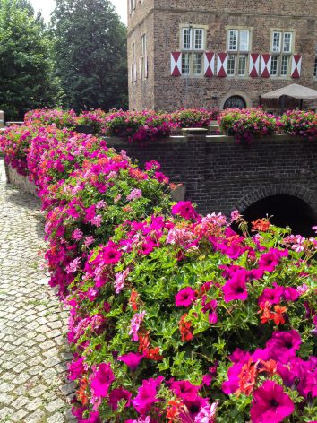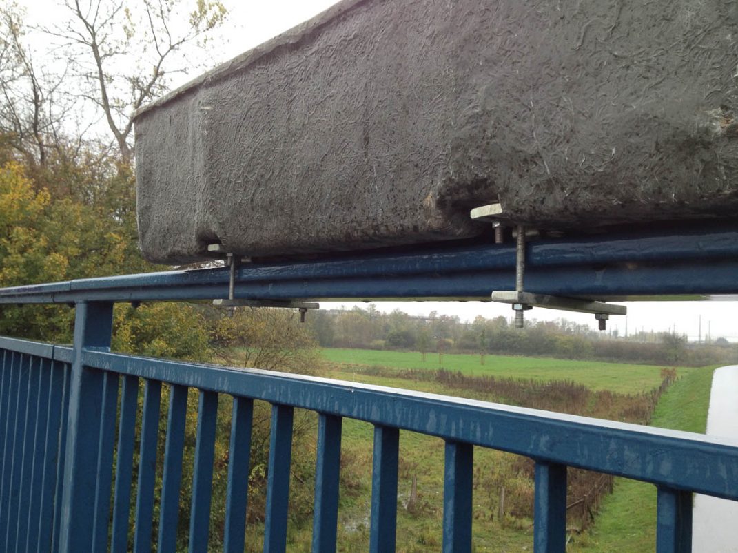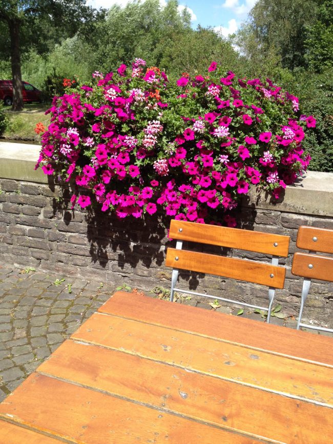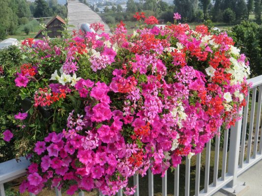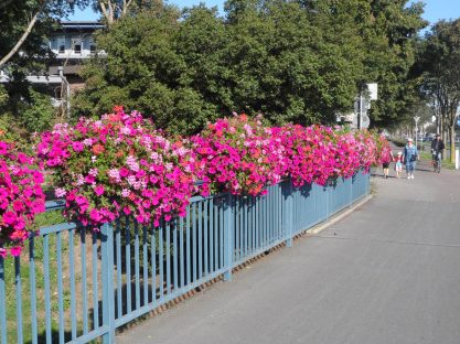 Wartungsfreundliche Brückenkasten mit Beflanzung nach Wahl, z.B. Geranien, Surfinea oder gemischt.