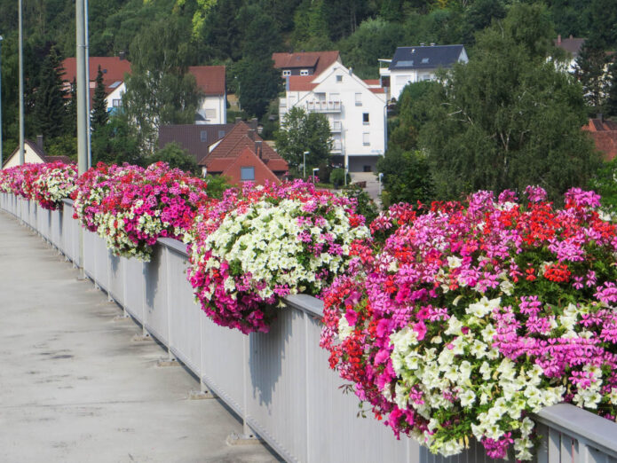 Farbenfrohe, reichblühende Sommerpflanzen in dekorativen Töpfen und KübelnGeranien